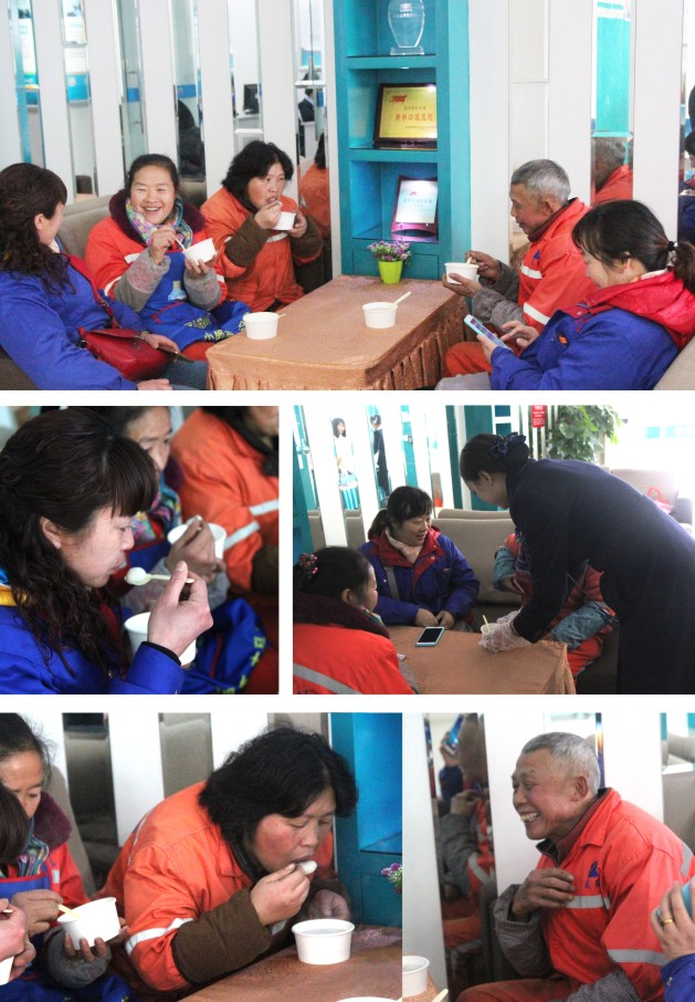 辛苦的完成上午的工作后,受邀而来的环卫工人们陆续抵达。新桥口腔的工作人员把早已预备好的汤圆放入锅中煮好,依次送到环卫工人手上。