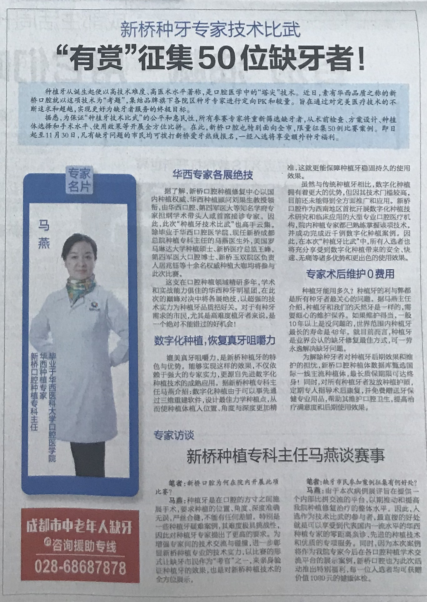 新桥种牙专家技术比武 “有赏”征集50位缺牙者