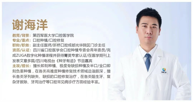 新桥口腔成都光华院区种植专科主任谢海洋表示,为确保种牙安全可靠,新桥口腔建立了完善的保障体系:术前通过麻醉、内科双评估,全面掌握患者身体情况;术中严格遵循金标准流程并全程监测生命体征,确保手术精准规范;术后提供完善维养与质保服务,保障长期使用效果。新桥口腔以严谨体系和规范流程,有效规避种牙风险,让患者安心种牙,以每年成功完成数万例的种植修复案例位居行业前列。
