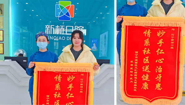活动最后,西宁市城西区文汇路街道文博路社区代表向新桥口腔西宁院区赠送了一面锦旗“妙手仁心治牙患 情系社区送健康”,对院区积极参与社区公益服务、普及口腔健康知识的专业精神表示高度认可和感谢。